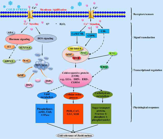 基于生理生化和转录组学,我们提出了伽师瓜响应冷胁迫分子作用机制的假设模型。细胞膜首先感受到冷信号并产生膜硬化,之后Ca2+通道打开产生Ca2+信号,质膜蛋白CML和CDPK被激活并作用于下游的转录因子。受到激活的转录因子进而调控下游的COR基因,COR基因通过参与伽师瓜果实体内的脂质代谢、细胞氧化还原和碳水化合物代谢,来减轻果实细胞膜的伤害,维持机体氧化还原的稳定以及代谢平衡来响应冷胁迫。