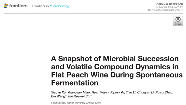 蟠桃已然成为消费者生活中重要的水果之一。但蟠桃属于呼吸跃变型果实,其皮薄,使其在采后运输过程中,极易受机械损伤和微生物感染发生腐败变质。物理保鲜、化学保鲜和生物保鲜等方法已被开发用于蟠桃的保鲜,但这些方法不能从根本上解决蟠桃采后保鲜的问题。因此,有必要开发多样化的蟠桃产品以满足消费者和市场的需求。目前,蟠桃已被加工成蟠桃汁、桃醋、果酒等产品。果酒因兼具水果风味和营养,是众多水果深加工的方式。其中,自然发酵的蟠桃酒富含风味和芳香化合物,但发酵过程复杂,发酵机理尚不明确。