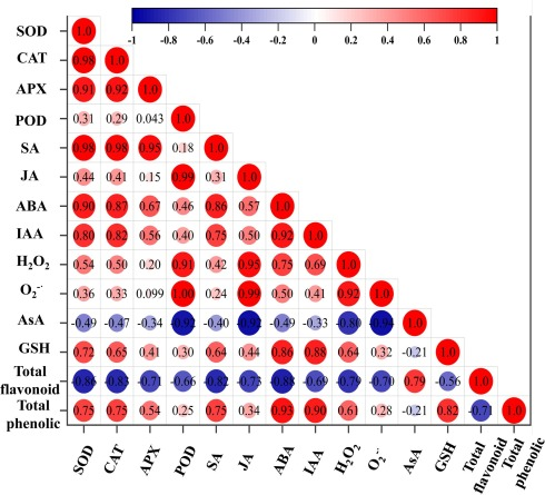 本研究调查了外源水杨酸(SA)处理(0,对照;3 mmol L−1)在4 °C下货架期期间(20 d)冬枣的抗氧化和激素水平。结果表明,3 mmol L−1SA处理较好地维持了果实的硬度,色度,TA,TSS,有效降低了TSS/TA值(13.08%),且与对照组相比,SA组具有较高含量的蔗糖(14.03%)和苹果酸(29.13%)含量。同时,SA通过增强果实中的抗氧化酶(SOD、POD、CAT、APX)活性和抗氧化物质(ASA、总酚、总黄酮、GSH)的含量,减少了H2O2(27.73%)和O2·-(45.44%)的积累。此外,SA处理有更高的内源ABA(18.49%)、SA(20.47%)的水平,更低的JA(42.68%)水平,而对IAA水平的影响微弱。