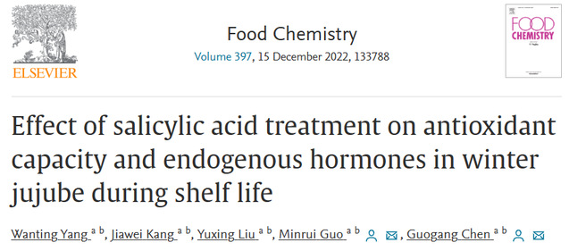 水杨酸(SA)是植物体内天然存在的小分子酚类化合物,在植物的生长发育过程中起着重要的调节作用。自由基清除系统(酶促抗氧化系统,非酶抗氧化系统)作为植物体内抗氧化系统的关键组分,在调控活性氧(如H2O2、O2·-)代谢、维持植物体内固有的氧化还原体系平衡发挥重要作用。而外源的水杨酸处理可以通过调节植物的抗氧化性能和内源激素水平,从而达到延缓果实衰老、延长货架期的目的。据报道,外源水杨酸处理对增强柠檬、葡萄、枸杞等果实的抗氧化特性有重要贡献。
