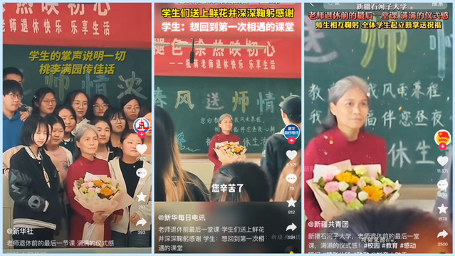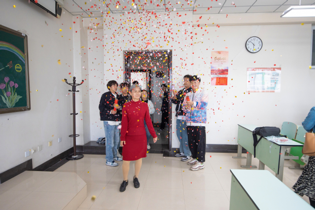 欢送会的另一个会场安排了别开生面的“最后一堂课”。4月24日,2020级食品质量与安全专业学生为蒋老师主讲的食品免疫学课准备了一个惊喜。当蒋老师推开教室门的那一刻,礼花喷洒,同学们跟着鼓掌欢呼,献上鲜花,全体学生起立为老师朗诵诗词致谢,共话师恩情深。现场有同学将这一场景记录在抖音发布,“有温度”的“仪式感”引发无数人动容,同时被新华社、光明网等各大媒体相继转发,最高点赞数突破12万。