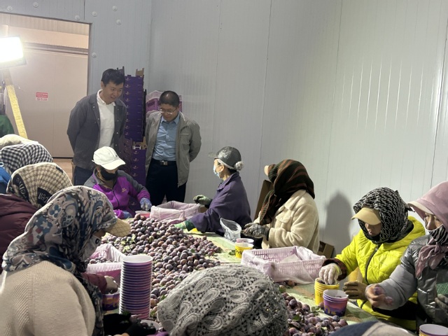 在特克斯西梅种植基地,陈国刚教授一行深入了解了西梅的生长状况、采摘过程、加工生产线及基地冷库设施,针对西梅浓缩汁糖分高、易氧化和风味物质易散失等特点,对其加工工艺的改进提出了建设性意见,并对西梅冷库使用中存在的问题等提出了几点建议,他强调应在西梅果实贮前进行预冷处理,并在整个贮藏过程中精准控温控湿,以提高冷库使用的效率和质量。西梅基地的管理团队对陈国刚教授的专业见解表示赞赏和认可,双方就深化未来合作,搭建院企科研交流平台达成了共识。