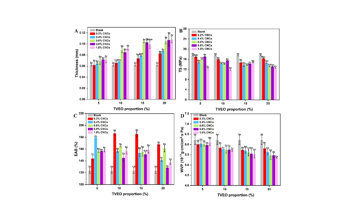 Figure 2. Physical and mechanical properties of emulsion composite films. (A) Thickness, (B) tensile strength (TS), (C) elongation at break (EAB) and (D) water vapor transmission coefficient (WVP) of modified tapioca/PVA films loaded with TVEO-Pickering emulsion. Different uppercase letters (A-E) in the same TVEO proportion indicate significant differences (p < 0.05). Different lowercase letter (a-e) in the same CNCs concentration indicates significant differences (p < 0.05).