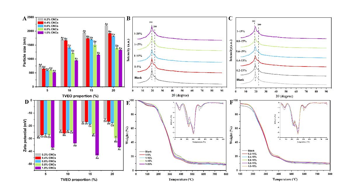 Figure 1. Pickering emulsion properties and characterization of emulsion composite film structure. (A) Particle size and (D) Zeta potential of Pickering emulsions prepared at different CNCs concentrations (0.2%-1.0%) and oil-to-water ratios (5%-20%). X-ray diffraction (B) and (C) and TGA images (E) and (F) of modified tapioca/PVA films of Pickering emulsions prepared at oil-water ratios (5%-20%) and different CNCs concentrations (0.2%-1.0%). Different uppercase letters (A-E) in the same TVEO proportion indicate significant differences (p < 0.05). Different lowercase letter (a-e) in the same CNCs concentration indicates significant differences (p < 0.05). The inset image represents the DTG curves for the corresponding thermograms.
