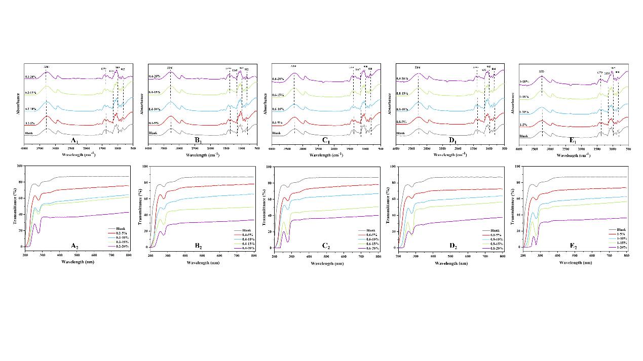 Figure 4. ATR-FTIR (A1-E1) and light transmission (A2-E2) images of modified tapioca/PVA films of Pickering emulsions prepared at different oil-to-water ratios (5%-20%) with different concentration CNCs (0.2%-1.0%).