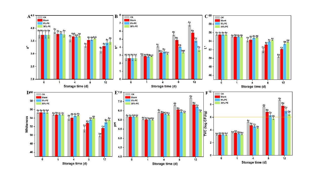 Figure 6. Changes in the properties of fish fillets stored by emulsion composite films. (A-D) Redness, yellowness, brightness and whiteness of fish fillets, (E) Changes in pH of fish fillets, (F) Changes in total colony count of fish fillets. Different uppercase letters (A-E) in the same TVEO proportion indicate significant differences (p < 0.05). Different lowercase letter (a-e) in the same CNCs concentration indicates significant differences (p < 0.05).
