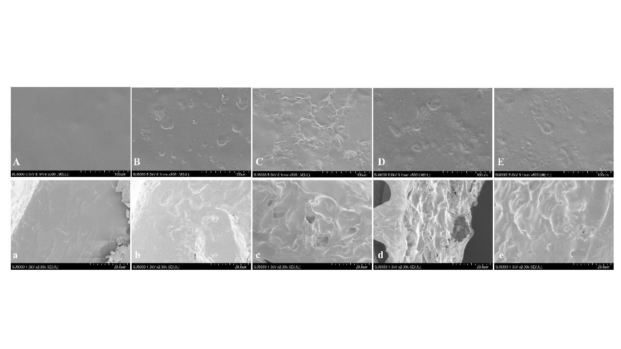 Figure 3. SEM images of modified tapioca/PVA films loaded with TVEO-Pickering emulsion: A-E are the surfaces of Blank, 0.2-5%, 0.2-15%, 1-5%, 1-15% films, respectively; a-e are Blank, 0.2-5%, 0.2 -15%, 1-5%, 1-15% film cross-section.
