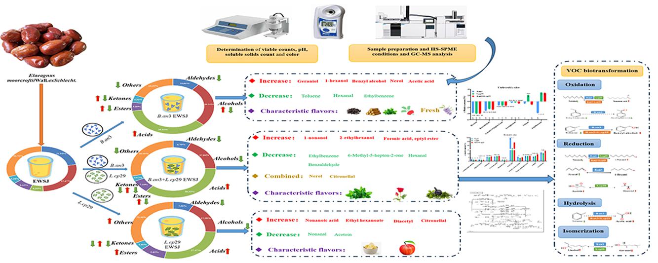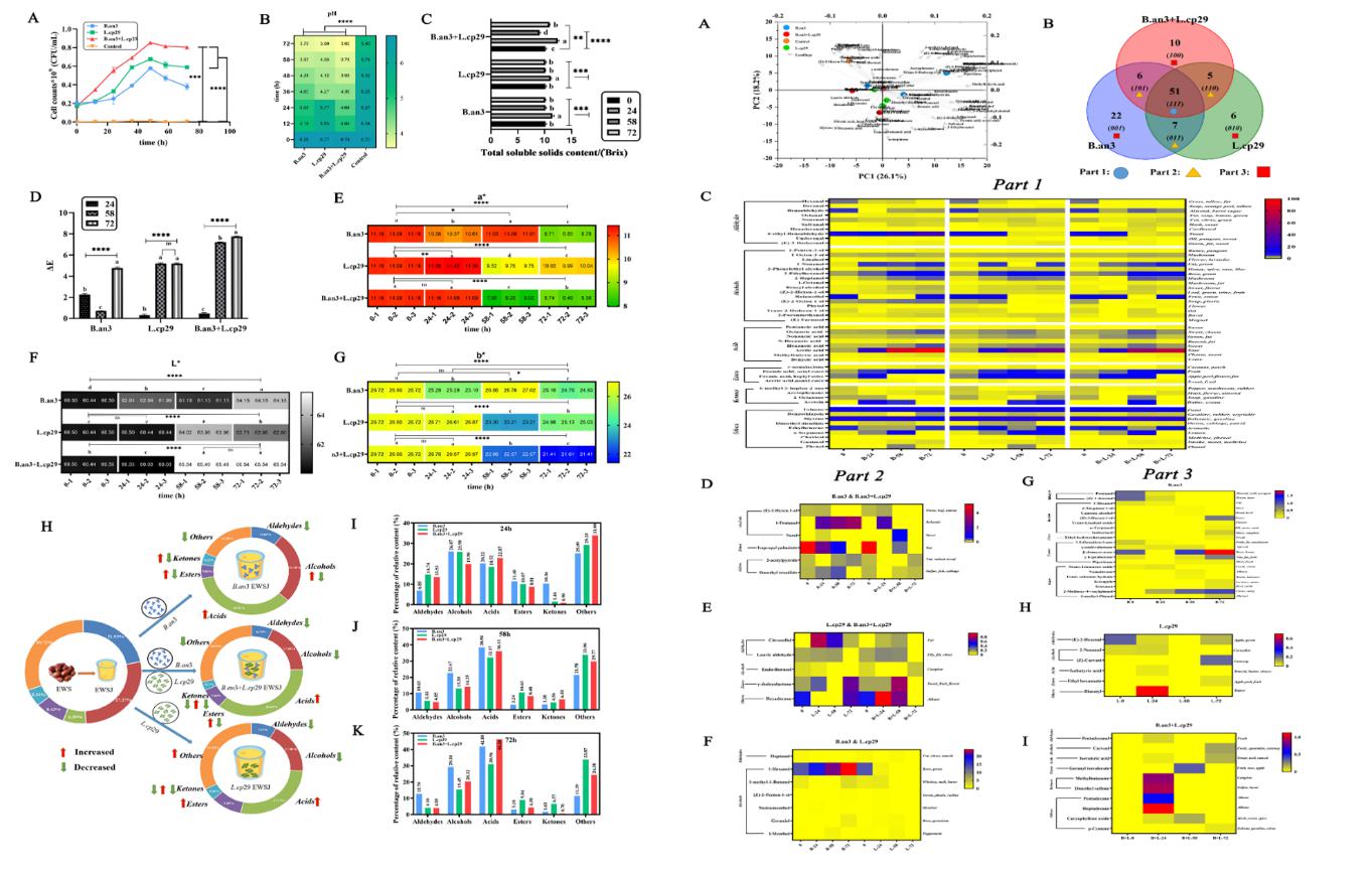 本研究比较了动物双歧乳杆菌乳亚种HN-3B.an3)和副干酪乳酪杆菌YL-29 (L.cp29) 以单菌和混菌发酵对大果沙枣果汁(EWSJ)的挥发性气味(VOCs)的影响和探讨了对气味成分的转化机制。然后,结合 HS-SPME-GC-MS技术,研究 VOCs 成分的变化, 分析 B.an3L.cp29相互作用,并探索 B.an3单菌发酵、L.cp29 单菌发酵和 B.an3 + L.cp29 混合发酵过程中 VOCs 生物转化的机制。这项工作为生产独特风味的动物双歧乳杆菌乳亚种HN-3B.an3)发酵大果沙枣果汁,副干酪乳酪杆菌YL-29 (L.cp29) 发酵大果沙枣果汁和B.an3 + L.cp29混合发酵大果沙枣果汁提供了新的见解。此外,两种益生菌混合发酵更有利于开发具有更强功能活性的益生菌发酵植物产品。