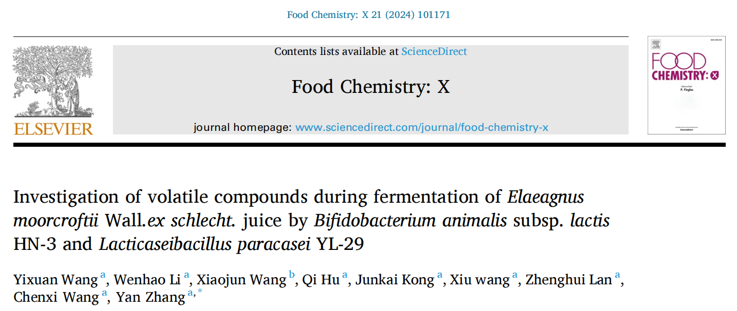 【学术前沿】动物双歧杆菌乳亚种HN-3和副干酪乳杆菌YL-29发酵大果沙枣中挥发性化合物的研究
