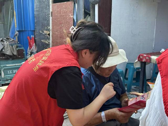 实践团成员结合丰富的专业知识,在早市发放宣传册,向居民们普及食品安全常识。