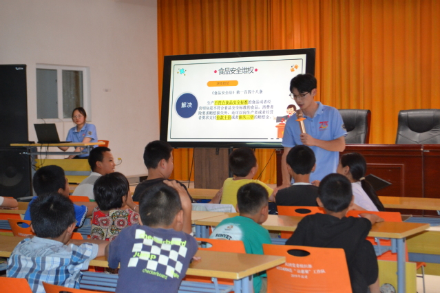 课堂中,小朋友们认真听讲,积极讨论,气氛活跃。实践团成员们用生动通俗的语言,结合有趣的案例和互动游戏,向小朋友们介绍了校园安全食品安全和假期自护等方面的安全知识。一个个鲜活的案例,带小朋友们深刻认识到了遵守法律法规的重要性,明白了如何正确运用法律武器来保护自己的合法权益