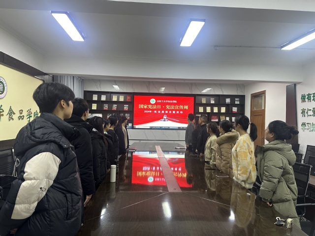 食品学院于2024年12月1日起举办宪法周主题活动,并组织团学干部集体学宪法、各团支部集体讲宪法等各式活动,提升学生法治意识,体现宪法权威在青年学生心中沉甸甸的分量。