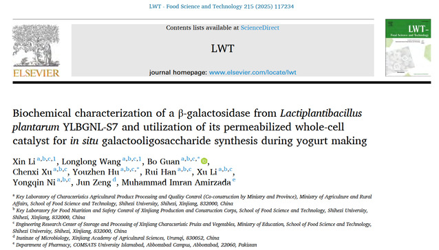 近日,食品学院关波教授、胡有贞副教授指导研究生在LWT-Food science and technology(中科院一区Top,IF=6.0)发表了题为 “Biochemical Characterization of a β-Galactosidase from Lactiplantibacillus plantarum YLBGNL-S7 and Utilization of its Permeabilized Whole-cell Catalyst for in situ Galactooligosaccharide Synthesis during Yogurt Making(植物乳植杆菌YLBGNL-S7 β-半乳糖苷酶的生化特性及其透性化全细胞催化剂在酸乳制备过程中原位合成低聚半乳糖的应用)”的原创性研究论文。