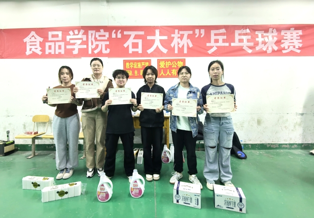 闭幕式上,研究生会主席为获奖选手颁发奖品。单打冠军获专业乒乓球胶皮,双打冠军获牛奶礼盒;亚军及季军分别获得乒乓球、日用品等奖励。