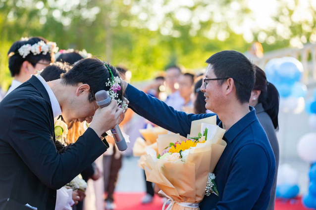 典礼上,最动人的时刻莫过于毕业生代表为教师献花,而教师们则回赠花环。这一刻,师生之间的情谊在花香中弥漫,字字珍重、句句恳切。毕业生和老师们一同回望进校以来生活、学习、工作的点滴,无论是宿舍里无微不至的关怀,还是学生工作中默契的合作,都在师生心中留下了最温暖的一角。这些珍贵的回忆,将成为他们心中永远的宝藏。