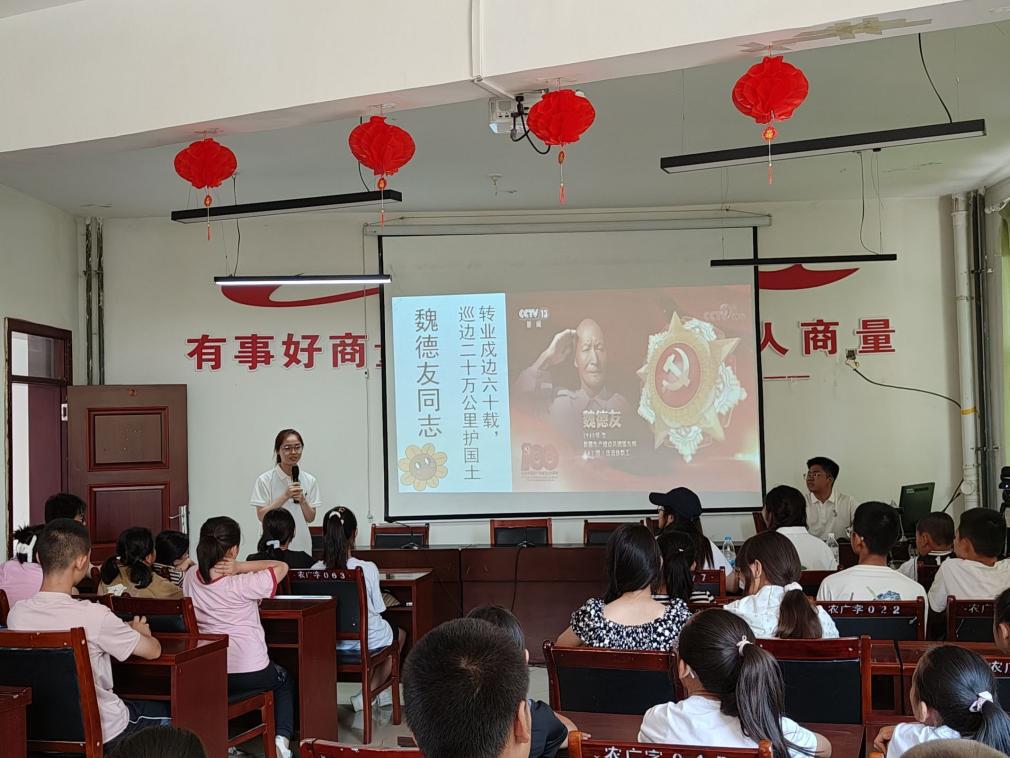 “小朋友们,谁知道魏德友爷爷‘活界碑的故事’呀?”实践团成员杜英姿边说边迈开步子向前走,仿佛正在穿越边境的风沙。为传承兵团故事,弘扬爱国精神,2025年7月11日,食品学院赴第六师寻访兵团故事实践团走进第六师滨河社区,为社区的小朋友们开展了一场生动鲜活的兵团故事宣讲活动,以寓教于乐的形式播撒红色种子,让兵团精神在孩子们心中生根发芽。