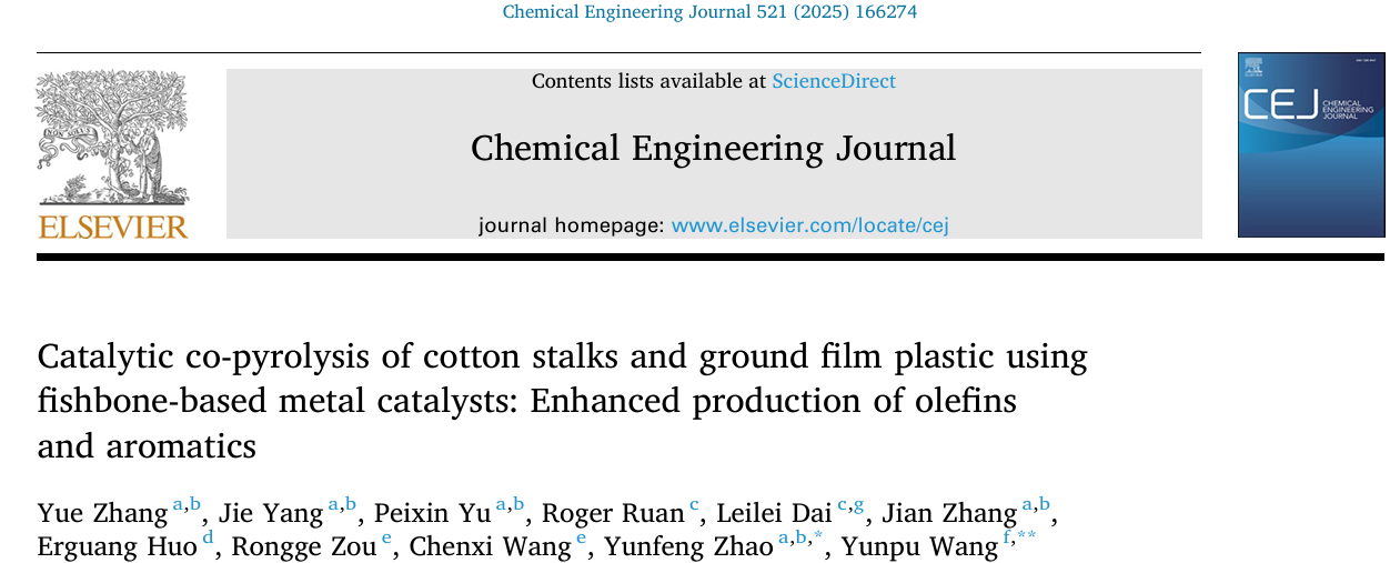 营养与功能食品研究团队在生物质等废弃物热解领域取得重要研究进展,成果以Catalytic co-pyrolysis of cotton stalks and ground film plastic using fishbone-based metal catalysts: Enhanced production of olefins and aromatics在材料科学领域国际知名期刊《Chemical Engineering Journal》上接收发表(中科院1TOPIF=13.2)。