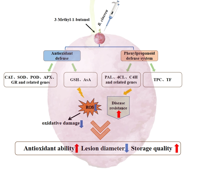 为此,该研究探索了3-甲基-1-丁醇对红提葡萄灰霉病抗性的调控机制。研究发现,经3-甲基-1-丁醇处理,有效抑制了灰葡萄孢菌在红提果实表面病斑直径的发展,延缓了红提葡萄的品质劣变;进一步分析显示,3-甲基-1-丁醇处理增强了苯丙氨酸解胺酶(PAL)、肉桂酸-4-羟化酶(C4H)、4-香豆酸辅酶A连接酶(4CL)活力和基因表达水平并促进相关次生代谢物积累来激活苯丙烷代谢;此外,活性氧(ROS)代谢分析显示,3-甲基-1-丁醇处理减少了过氧化氢(H2O2)和超氧阴离子(O2-)的积累,这也刺激了与ROS清除相关的抗氧化酶活性和转录水平,以及谷胱甘肽-抗坏血酸循环协同改善氧化应激。总的来说,3-甲基-1-丁醇通过提高苯丙烷和ROS代谢维持了红提葡萄采后果实品质。该研究为采后葡萄果实中灰霉病的控制提供了一种安全有效的新型策略。