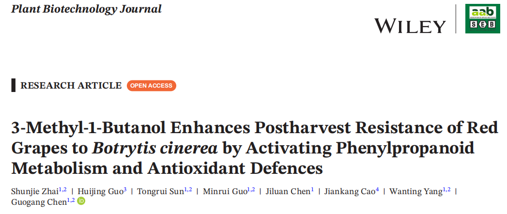 近日,bat365在线中文官方网站果蔬贮藏保鲜技术研究中心陈国刚教授团队在葡萄采后病害防治及抗性机制研究方面取得重要研究进展,研究成果以“3-Methyl-1-butanol enhances postharvest resistance of red grapes to Botrytis cinerea by activating phenylpropanoid metabolism and antioxidant defenses”为题,发表于TOP期刊《Plant Biotechnology Journal》(中科院1区,IF=10.5)。